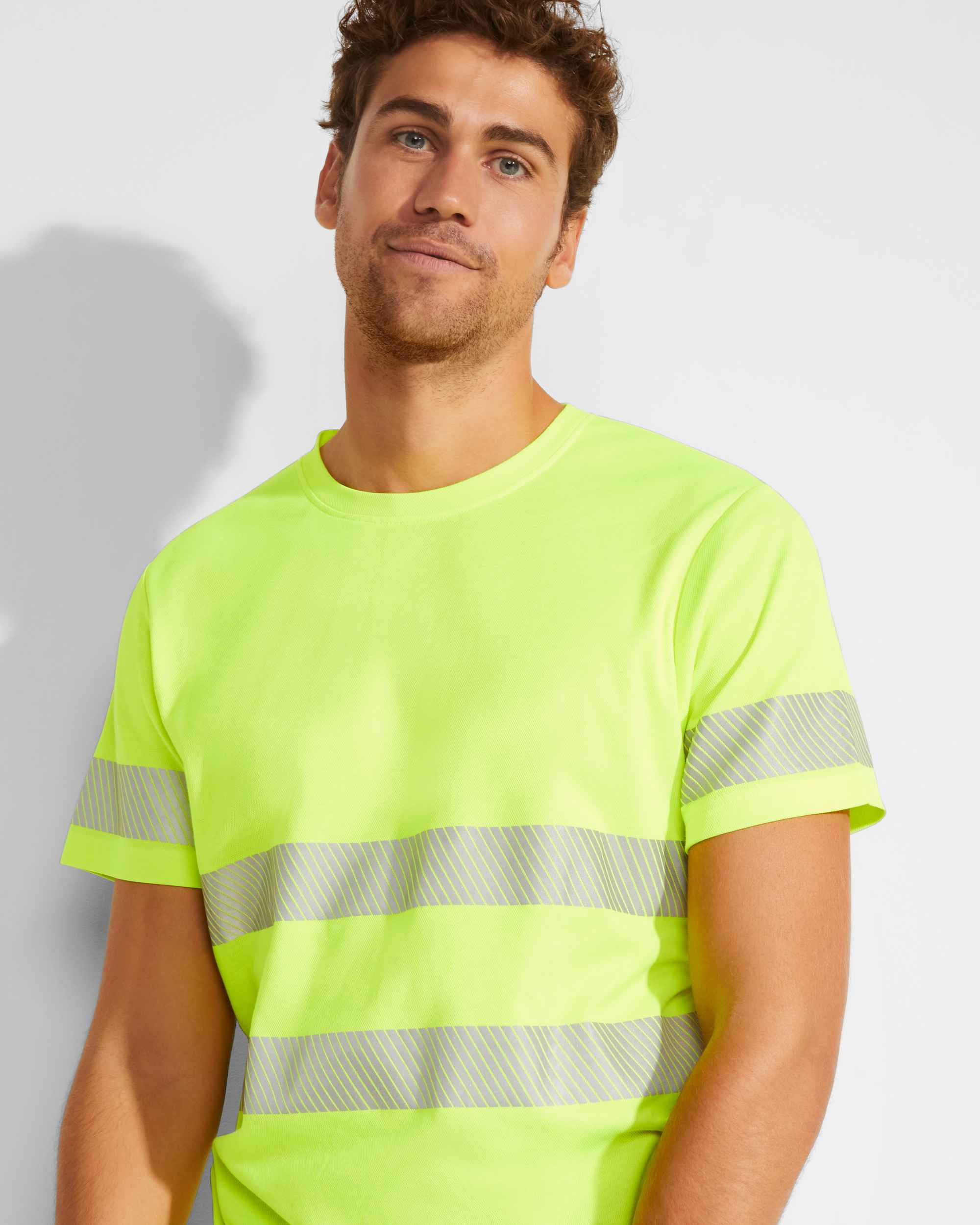 Technical high-visibility short-sleeve t-shirt for men with crew neck in main fabric. Two segmented high-visibility strips on chest and one on sleeves.