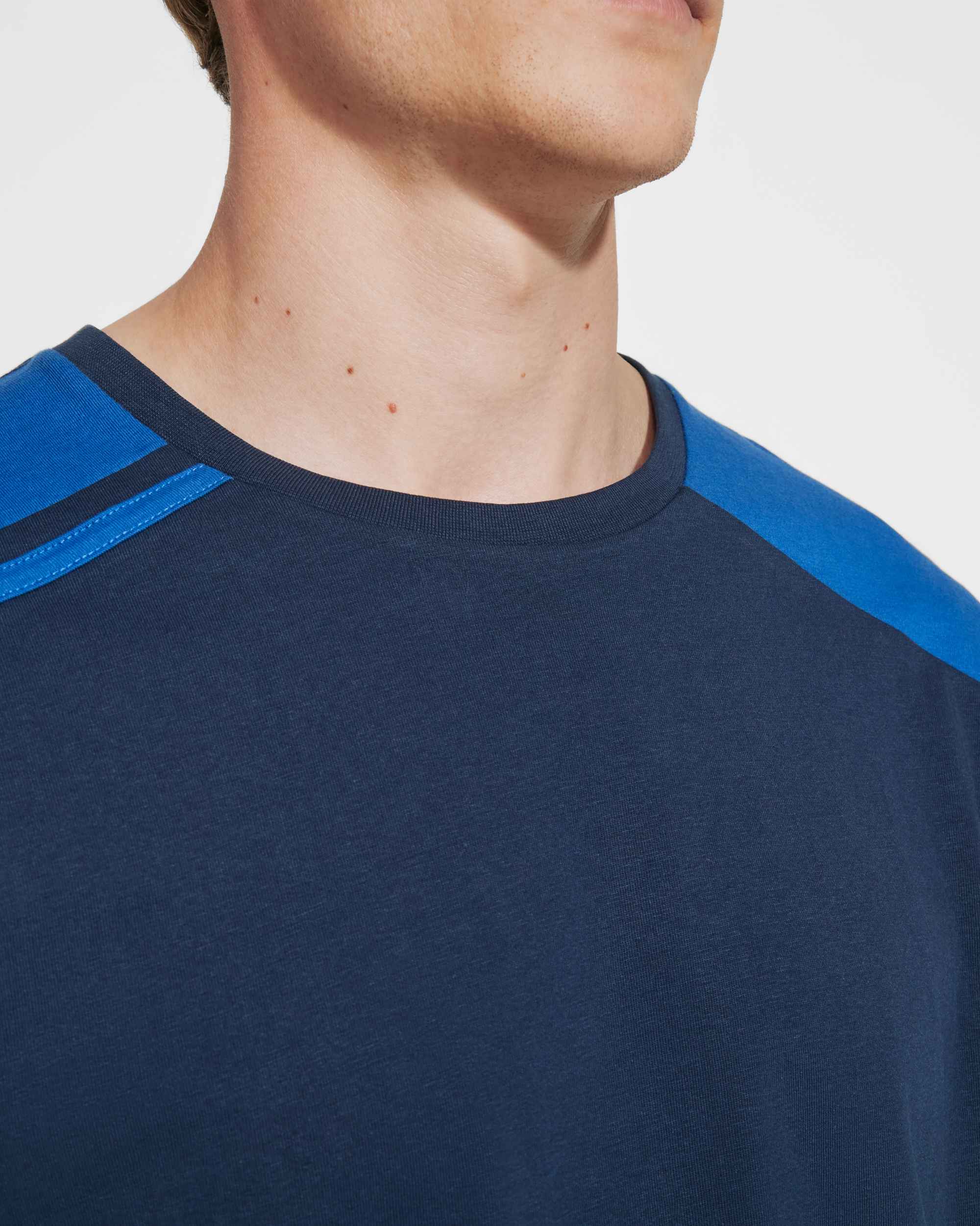 Short-sleeve t-shirt in a combination of colours. Crew neck with contrasting covered inner seams. Side seams. Contrasting shoulders and details.