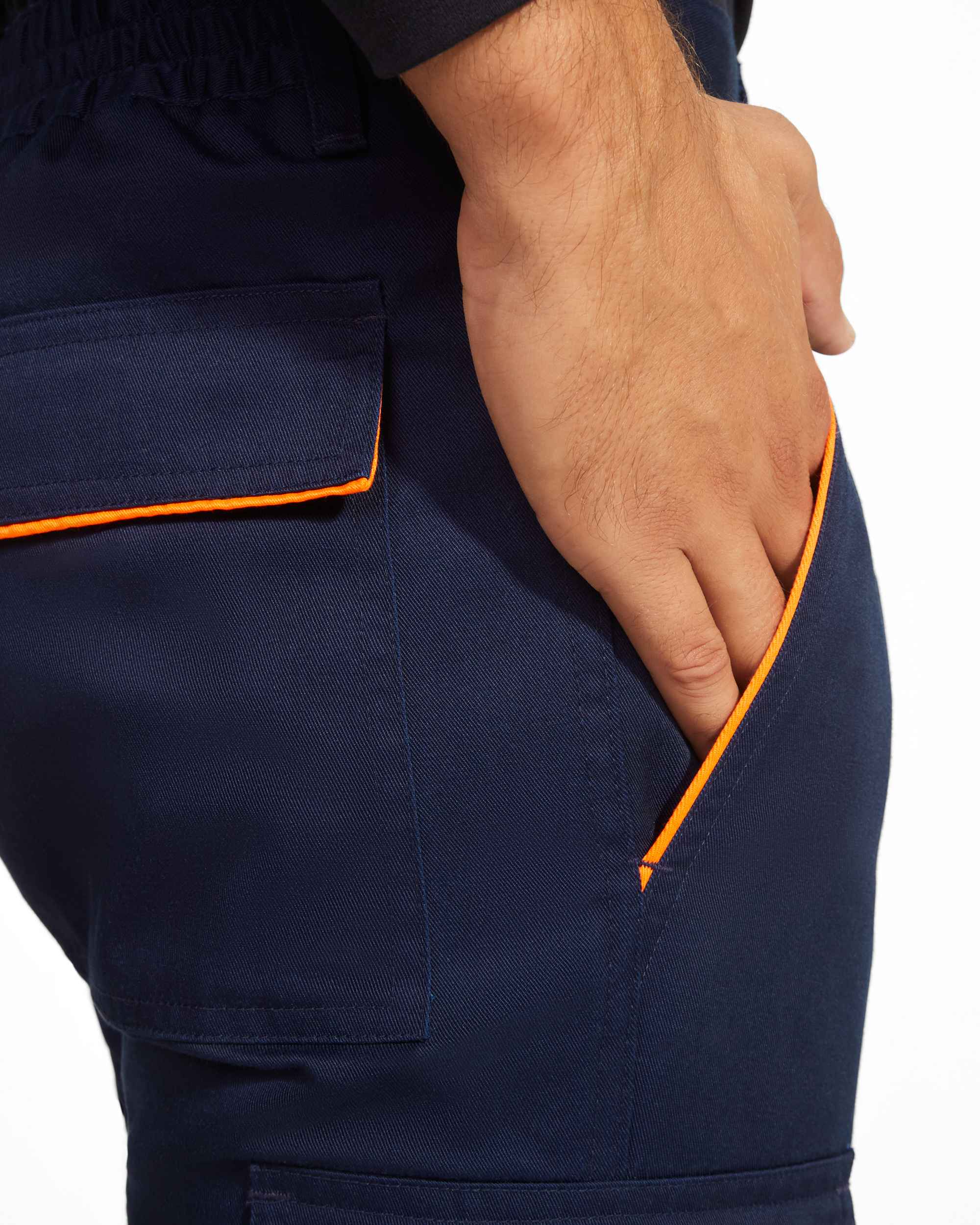 Lined high-visibility multipocket long trousers. Two-colour combination and high-visibility strips. Contrasting fluor details in pockets. Fleece lining. Elastic waistband on the back. Two front pockets. Two back pockets with flap and velcro fastening. Two pleated side pockets with flap and velcro fastening.