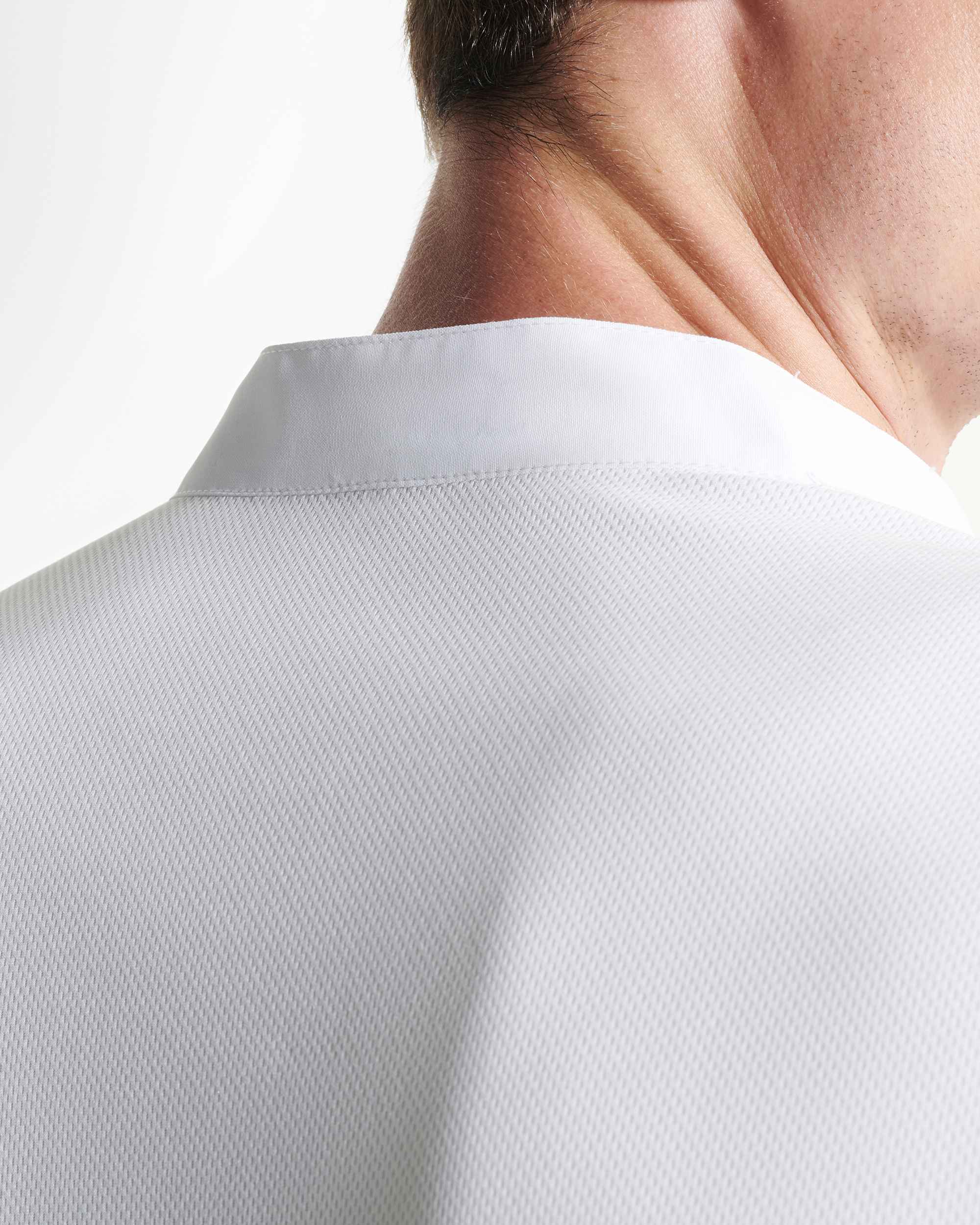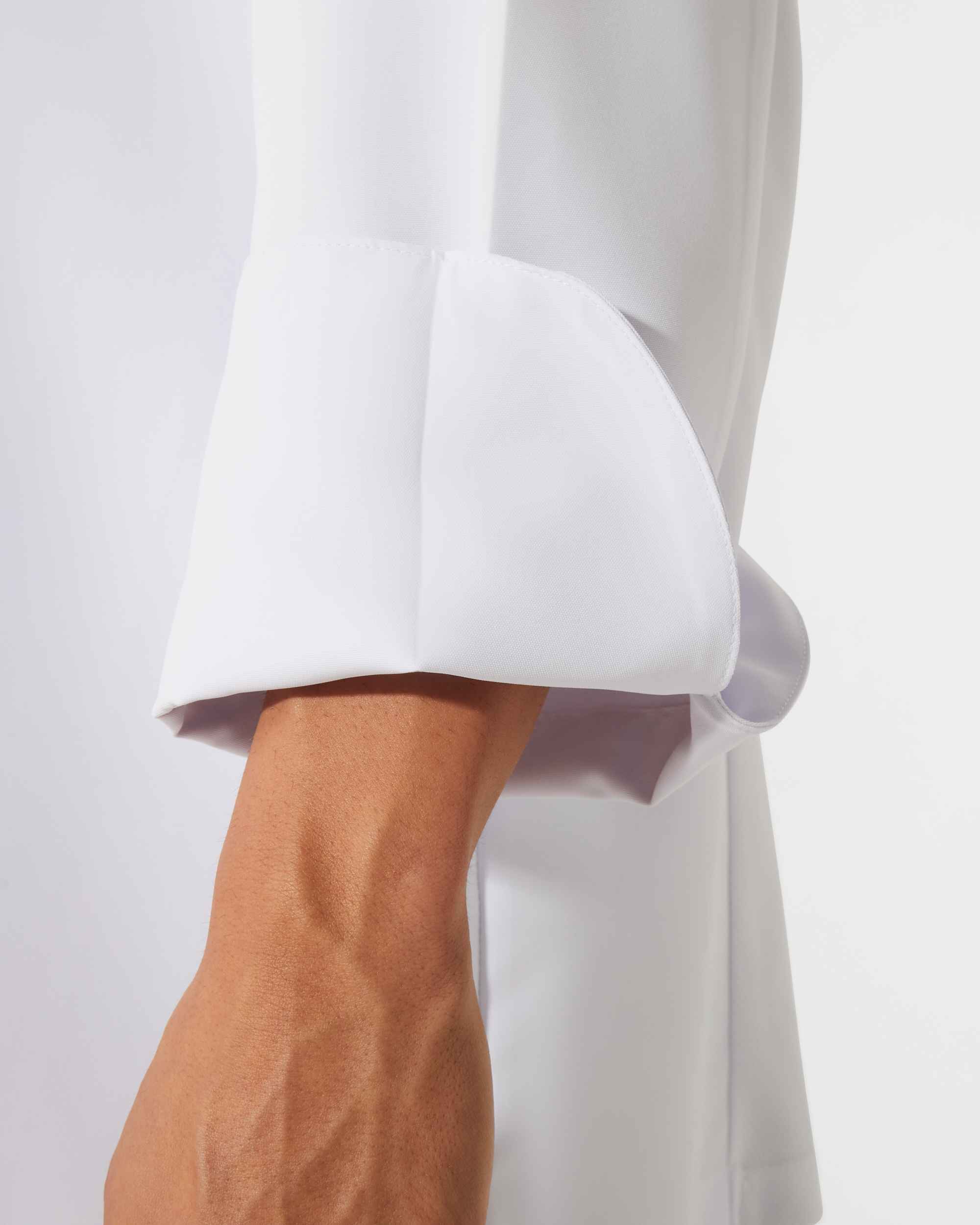 Long-sleeve chef jacket. Crossed front fastening with concealed press studs. Mandarin collar and tailored sleeves with turn-ups on cuffs. Back in breathable fabric. Patch pocket on left sleeve.