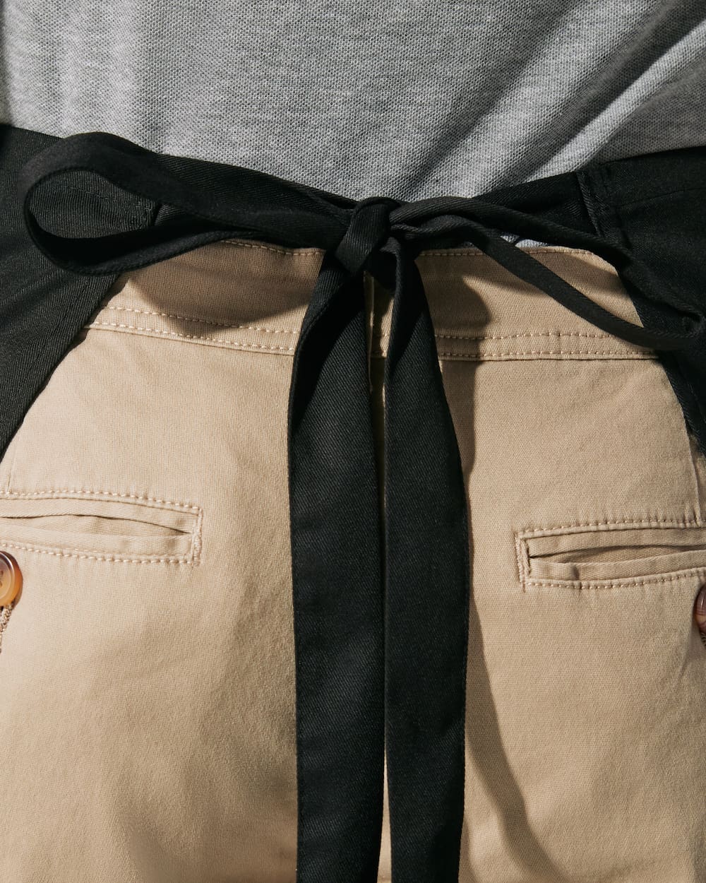 Short apron with two-compartment pocket. Waist tie-strap. Measures: 71 cm x 43 cm.