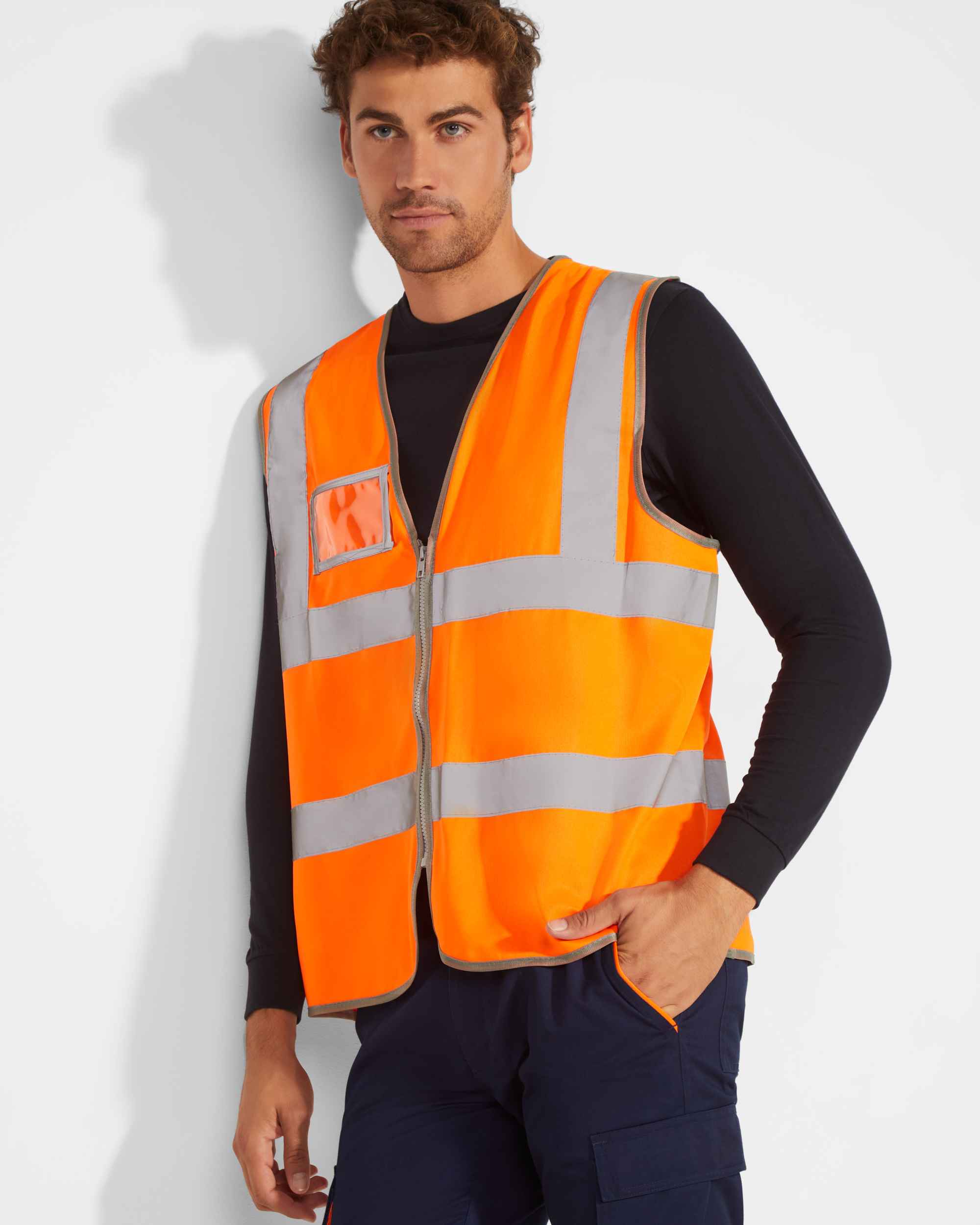 High-visibility vest with front zip. Two horizontal high-visibility strips on chest and vertical ones on shoulders. Transparent pocket on right chest for ID tag.