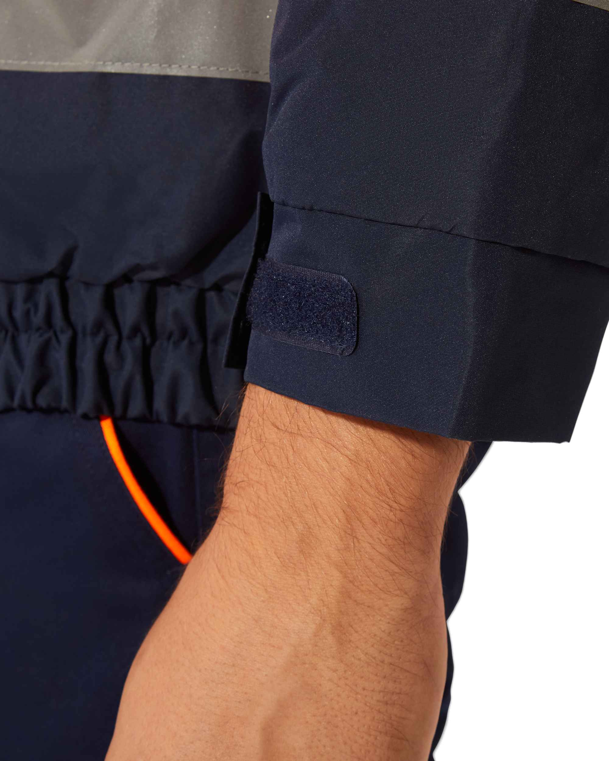 6. Adjustable cuffs with elastic and velcro fasteners.