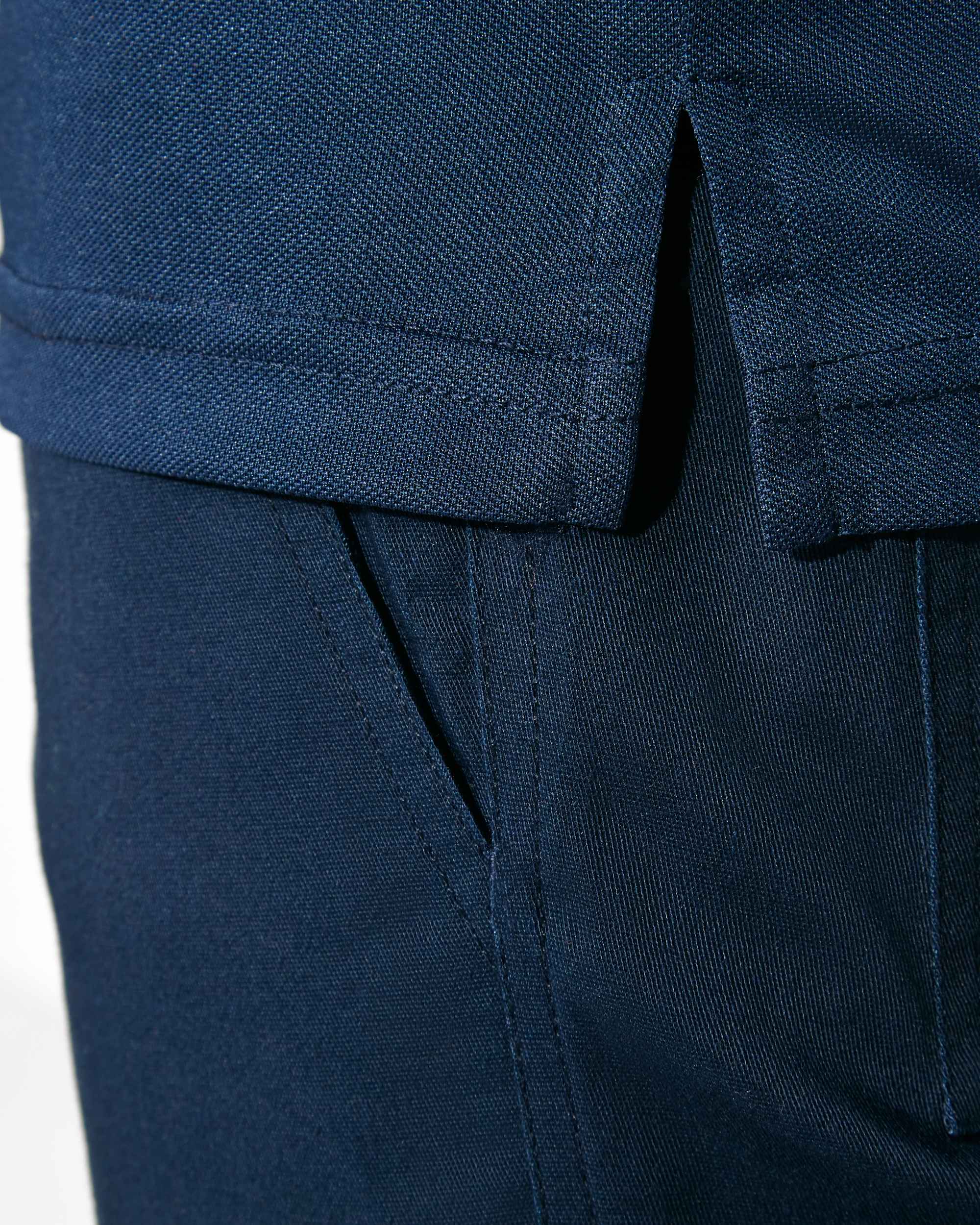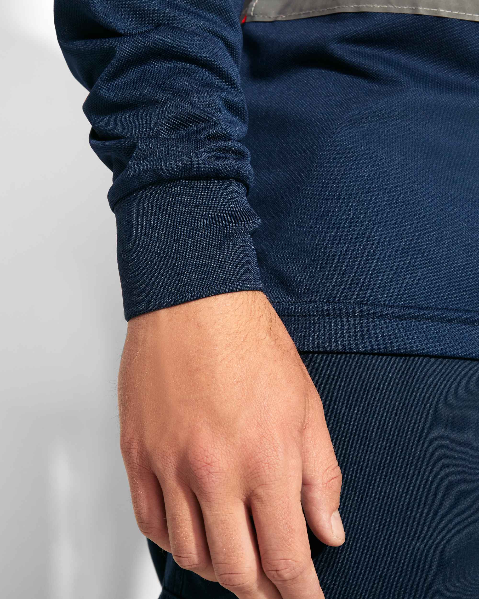 Technical high-visibility long-sleeve polo shirt with 3-button placket. 1×1 ribbed collar and cuffs. Two horizontal high-visibility strips on chest and sleeves. Anti-snagging fabric.